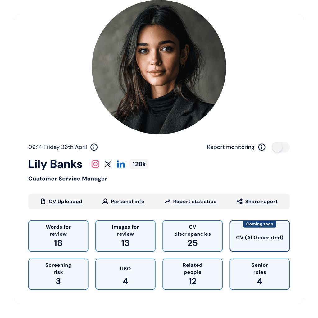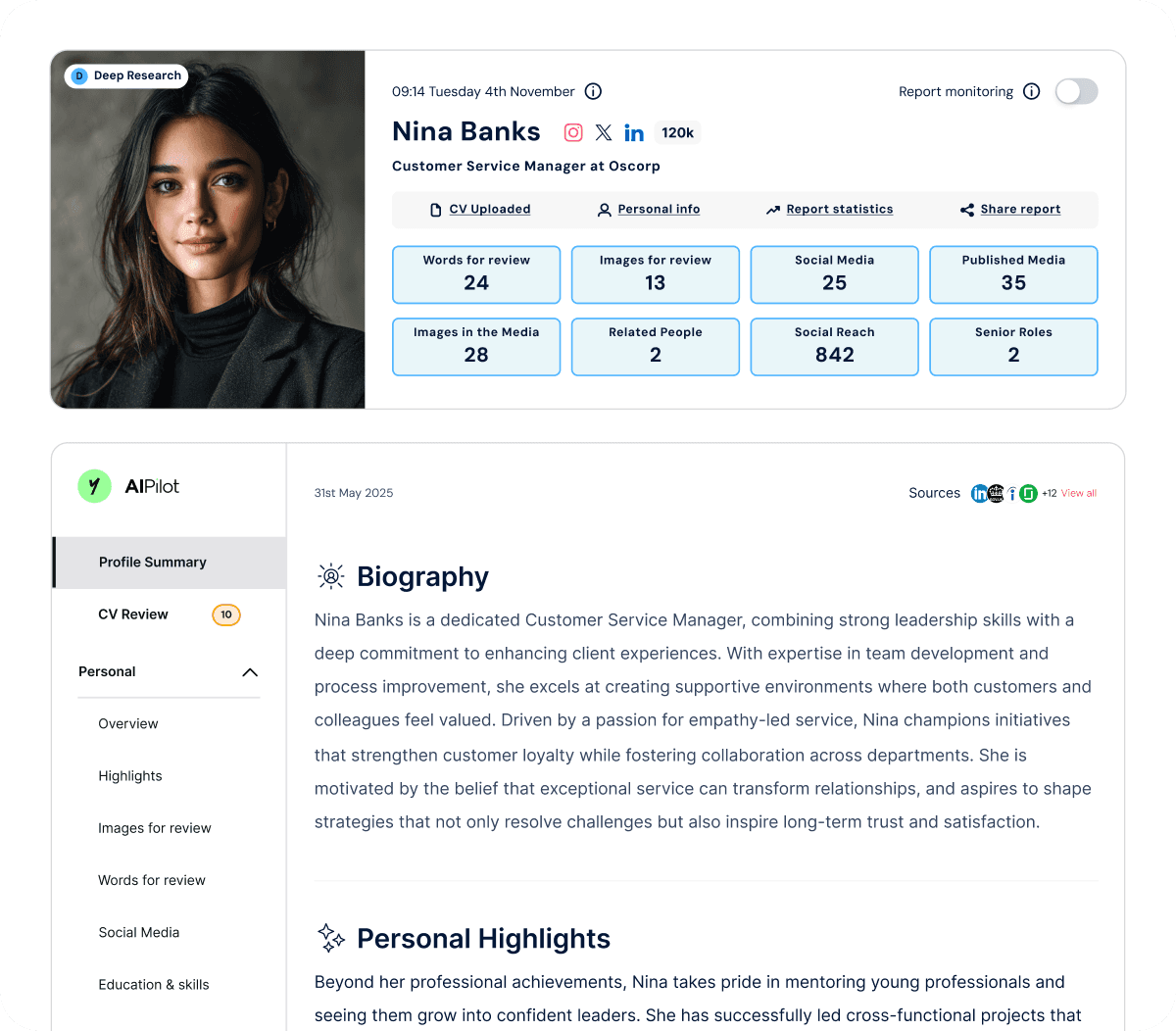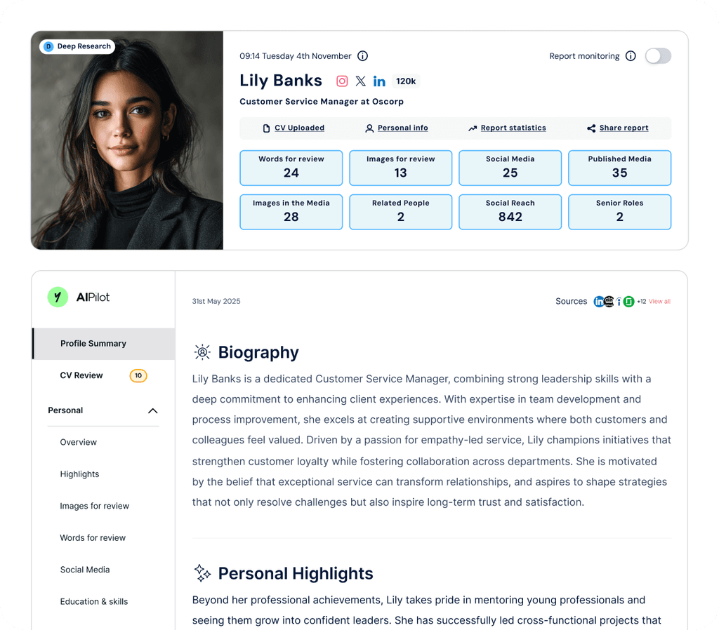 Our AI engine scans and interprets publicly available information to help you make confident, ethical decisions about people and organisations.